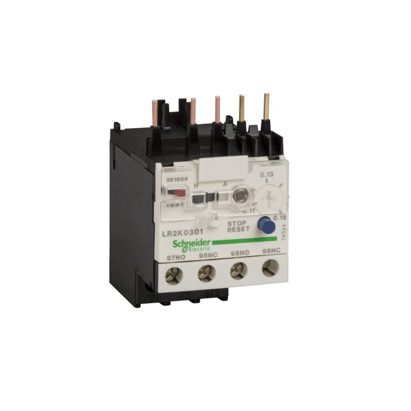 Relé de sobrecarga térmica TeSys LRK, 11,5A/690V, faixa de ajuste térmico 8-11,5A, classe de disparo 10A, para proteção de motores trifásicos 4kW@400V. Dispositivo diferencial com detecção de falta de fase e desequilíbrio de carga. Ele fornece um indicador de ajuste térmico, um seletor de reinicialização manual-automática, uma chave deslizante de teste para simulação de um disparo, botão de reinicialização/parada, um indicador de sinalizador e 2 contatos auxiliares 1NA+1NF para sinalização de falha. As configurações são protegidas por uma tampa transparente bloqueável por vedação. Conexão por bornes de parafuso, conecta-se diretamente aos terminais inferiores dos contatores 3 polos LC1K09-K16. Montagem em trilho DIN, separado do contator, com uso de borne LA7K0064 (a ser pedido separadamente). Certificação multipadrões (IEC, UL, CSA, CCC, EAC), compatível com (RoHS/REACh).